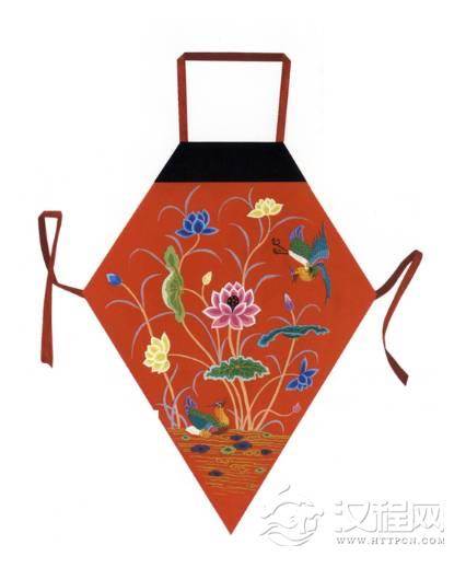 红色的莲花池肚兜,菱角分明,下方留出尖尖的角,据传世宝物绘制。