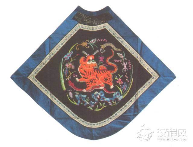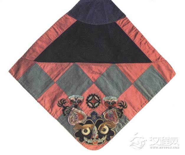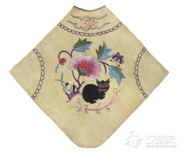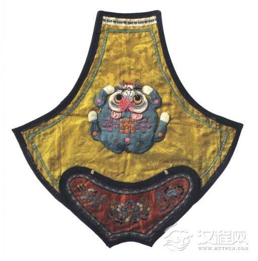 此肚兜菱形,上为半圆领,下端为圆角,中间黑地绣五彩艾虎五毒纹,此花纹常为民间作为避邪驱恶的象征。