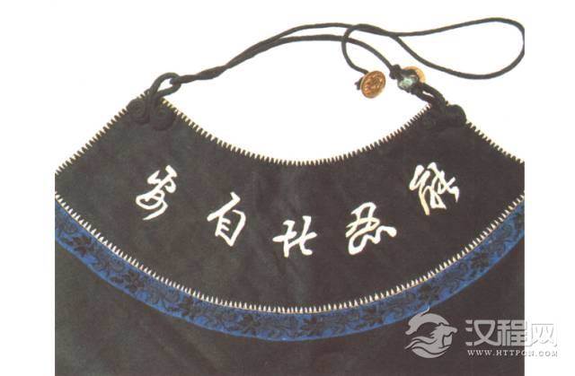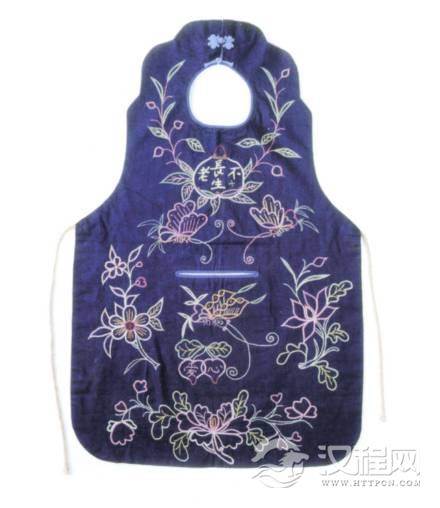 许多服饰或者服饰品上直接以文字表述“长生不老”和“长寿”含义。这是人性之使然,巴金说过“生”是美丽的,乐“生”是人的本分。动物不怕死,是它不知道有死这回事。怕死恋生,这是最正常最根本的人性。渴望生命长存,就是要做到民间文化中“积德行善”。因此,常常直接在围兜上绣上代表“善”的“爱心”,这样就可以使长寿的价值无限延伸和增值。