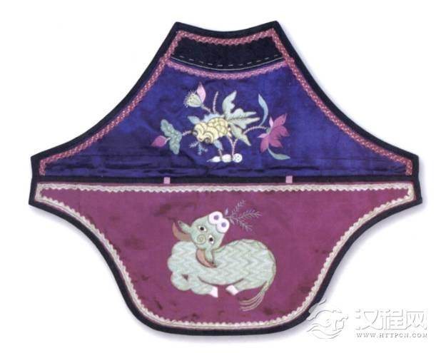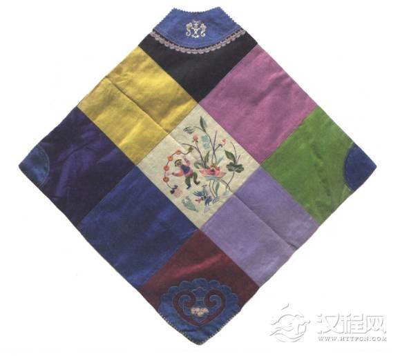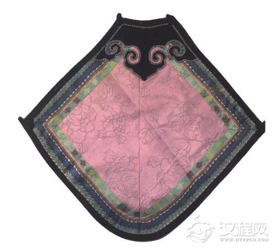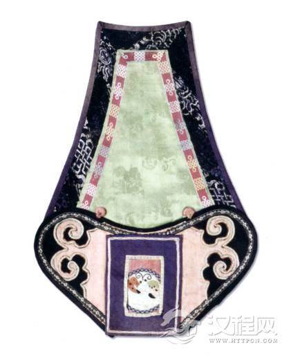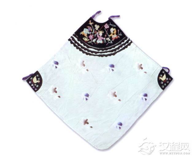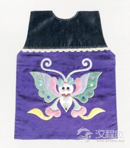 此肚兜为方形,上半黑地,下半部分紫地上贴绣彩蝶纹,图案精美,做工细致,是清代的传世珍宝。
