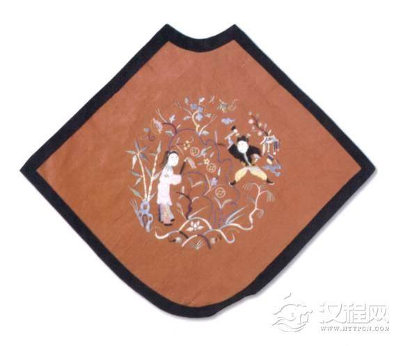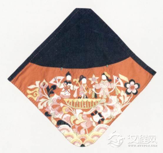 清代。此肚兜菱形,上半黑地,下半部分橘红色地上贴绣人物花卉纹,图案精美,做工细致,是中国服饰传世珍宝。