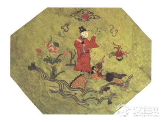 刘海蟾为道都人物,相传他见累钱之危而悟道成仙。其形象常被用作装饰纹样,寓意为放弃利禄,抛弃功名,粪土金钱。刘海蟾作童子状,身穿大袖之衫,两手甩穿钱之绳,戏钓三足金蟾,周围配以花树飞蝶。