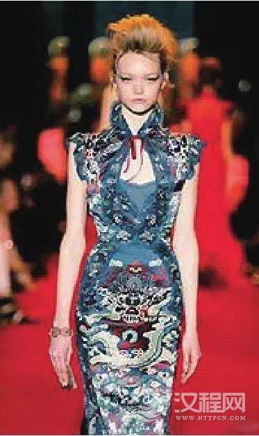 现代国际服饰的多元化发展深深的影响着国人的着装理念,当前中式服装设计企业更加注重从面料、款式、色彩、配饰等诸多方面进行改良升级,如国内比较成功的“才子”、“阁兰绣”等中式服装品牌,巧妙运用了中西合璧的设计理念,既突出时尚休闲又展示民族特色,体现了简洁、自由、得体的风格,近年来具有很高的市场占有率。国外著名设计师也运用中国传统元素设计了很多成功的作品;皮尔——卡丹(Pier re Cardin)在2009年的设计作品中,就大胆运用了中国龙的图案,创新使用了满族旗袍的造型,并将其与时尚设计相结合,创造了大气而新潮的旗袍新样式(见图3),可以说是把西方的服装形式与东方的满族服装风格结合得自然、融合的经典之作;而加利亚诺(John Gal l iano)在设计时装时,将盘扣、系结、立领等满族服饰元素与国际时尚设计进行了有机融合,从而设计出华丽又洒脱的新奇服装。