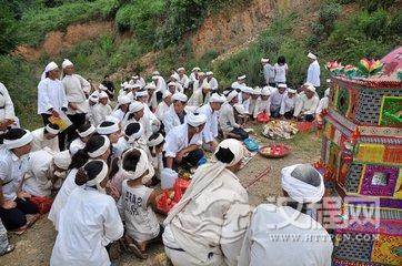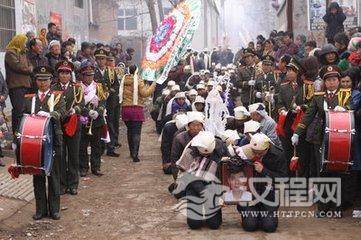 出丧出丧是殡葬仪式最热闹的一天。送殡时亲友汇齐,响器班吹吹打打,哭声连成一片。中午饭后,炮声隆隆,乡邻抬棺上车,称“起灵”。孝子持引魂幡,披麻戴孝,按长幼罗列,用白布拉灵,其他亲眷、亲友依次按辈份,亲疏排列于后。送葬队伍出发,挎蓝(内放遗饭碗)小孩在前引路,吹歌班及旗牌执事随后,男眷步行在灵柩前,女眷在灵后或骑马或坐车,浩浩荡荡,绕街出村。至墓地(女眷一般不到墓地)将棺木置入墓穴,唤死者儿女调正向口(棺材大头所向位置),放“长明灯”于棺前,棺上放“阴阳瓦”(瓦上写死者姓名,字、生卒年月),孝子绕墓穴分左右各转3圈,向墓穴扔土,烧“回头纸”,向乡邻亲朋叩首感谢,众人散开,将死者掩埋,堆起坟头,出丧结束。守孝老人亡故,谓“孝子帽压住了头”,从掩埋至“七满”(即七七四十九天),孝子、孝女或穿孝衣或臂戴黑纱,不理发刮须,每隔七天,带鞭炮、纸箔。香、烛、馒头,到坟前祭典,谓“烧尽七纸”。