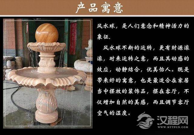 底盘(柱)装水,用水泵抽水向上喷而冲动上面的石球,使石球长期转动,象征着“财源滚滚”。