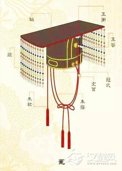 冕,上古最尊贵的礼冠,为黑色, 是天子、诸侯及众大夫在祭祀的时候佩戴的。冕的上面是一块长方形的木板称“延”或“綖”, 延的前沿挂有一串串的小圆玉,称做“旒”。天子、诸侯、大夫冕上的旒各有等差。到魏晋南北朝后,只有皇帝用冕,故“冕旒”成为帝王之代称。