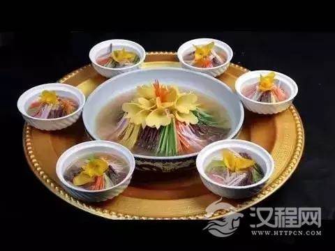 洛阳水席起源于唐代,全席24道菜,有八道冷下酒菜,四道大菜、八道中菜、四道压桌菜。牡丹燕菜是铁定会出场的角色,成品如一朵洁白如玉、色泽夺目的牡丹花,浮于汤面之上