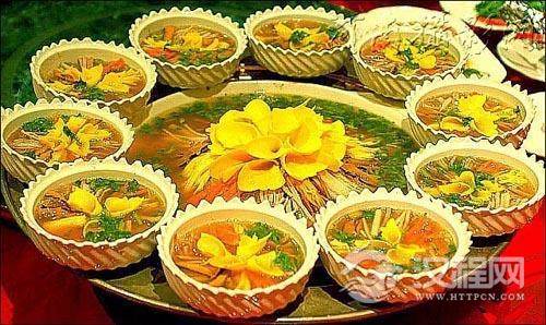 五大名羹(汤):酸辣乌鱼蛋汤、肚丝汤,又叫酸辣肚丝汤、烩三袋、生氽丸子、酸辣木樨汤。