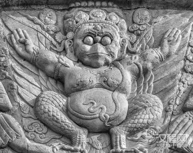 大鹏金翅鸟又叫做“琼鸟”, 藏文叫做“琼”,汉语叫做“鹏鸟”, 又叫做迦楼罗鸟,常装饰在佛教建筑的塔、殿之上。传说人类出现之初,到处有妖龙作祟,如来佛祖就派这些大鹏金翅鸟去啄走了妖龙,为人类的生存创造了清平世界,所以自古至今人们供奉这种大鹏金翅鸟,把大鹏金翅鸟当成护法神作为保佑平安的心灵寄托。