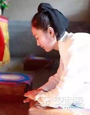 (3)左手离开右手捂心(心意散乱为道教之大忌,捂心表示以专一沉寂之心向神致敬),同时从容俯身,右手按跪垫,两膝下跪,紧接着,左手离开心口,按右手手背上,形成“十”字状,下跪的时候,男子跪下一大片,也就是说两个腿是分开的,女子跪下一条线,也就是两个腿要并着。