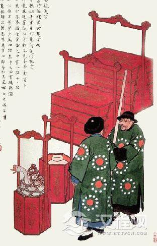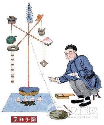 设高桌一张用簸箕内盛米香茶等数盅站于桌上,打金斗而下而所盛之物一粒不撒。