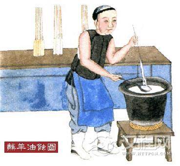 将羊油烧化,将油浇在灯芯上制成蜡烛,分八支一斤十支一斤不等,颜色分红白两色。