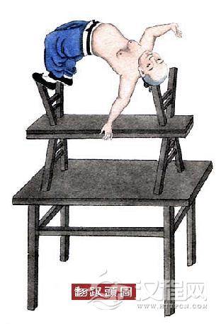 桌子上面放一板凳,板凳上面再仰放一板凳,将头放在板凳腿上,两脚也放在另一头的板凳腿上,然后翻身。