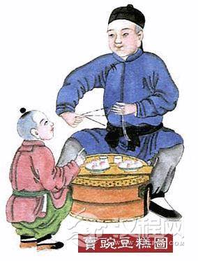 在北京走街串巷的小商贩中,最受小朋友们欢迎的是吹糖人儿的了。糖耗子是最便宜简单的糖人儿,吹糖人儿的小贩从用布盖着的小铁锅中,挖出拇指大小的一块糖稀,放在手上揉成长条,然后放在木模子里,一吹,这条长的糖稀就膨胀起来,打开木模一看,竟变成了一只活灵活现的小老鼠。“猴拉稀”就稍稍复杂些了,这是用手把糖稀捏制成一个小猴,立在一根小苇子杆上,底下是一个小糖碗,碗中放着一点稀糖糊糊,用一个耳挖勺大小的小糖勺舀着吃。