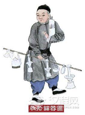 肩背口袋内装铁锉钳子等工具,手拿竹杆上拴灯台茶壶等器到住户门前吆喝,为人收拾锡器。