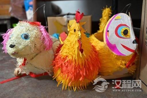 除了400个荷花灯,工作室里还有一排生肖灯,都是钟义臣退休四年来做的猴灯、鸡灯和狗灯,灯下面安装了轮子,牵了就能在地上跑,最讨孩子们喜欢。