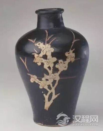 宋吉州窑黑釉剔花梅瓶高19cm,口径5cm,足径6.8cm。瓶小口,圆唇,短颈,丰肩,内凹足。通体施黑釉,器身剔折枝梅花,纹饰部分露黄色胎,花蕊用褐彩勾画,装饰效果极强。