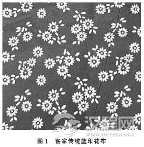 蓝白印花,初见给人一种清新脱俗的雅致美,随后便会带来一种淡淡的历史气息。这种印花布的图案多是一些简易的花朵,经过四方连续、重组、对称等多种形式组合在一起。花纹或大或小、排列规律又或者向外延伸而富有“节奏与韵律”的艺术美[4]。客家蓝印花布的应用范围不仅仅局限于服饰上,在被面、床单、桌布、包裹布、头巾、枕巾上均有运用。服饰上的运用多在围身裙、包头巾及年轻客家妇女的衣襟上。从审美特征来看,客家传统蓝印花布充满着原始、质朴及情感传达的独特之处,而这些蕴味的特殊之处与蓝印花图案简洁的自然之美相结合达到了一种给人难以忘怀的客家风情。