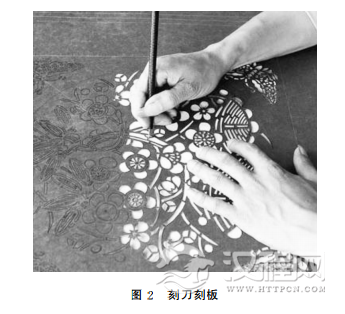蓝印花布是客家印染技术最具代表性的作品。蓝印花布运用传统的镂空版白浆防染印花技术,又称靛蓝花布,俗称“药斑布”、“浇花布”,距今已有 1300 年历史,图 1 为传统蓝印花布。客家蓝印花布印染的技法也是极具智慧性的,最初的蓝印花布形成是用蓝草为染料印染而成。在最初的印染过程中,需要随时随地关注印染的进程,稍有差池便会将所留白处的花纹晕染上,导致图案不清晰、整体效果不佳的毛病。客家人吸取教训得出了镂空刷白浆的方法,最终避免了这种情况的发生。传统蓝印花布制作流程是先用石灰、豆粉合成灰浆烤蓝,再通过全手工纺织、刻版、刮浆、染色等多道工艺完成[3]。其中,印花图案的形成要通过手工刻板形式将所需花形在特殊纸板上用刻刀垂直刻印的手法刻出两块相同的花版,图 2 为刻刀刻板过程图。