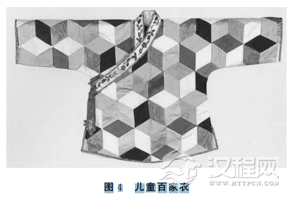 布贴工艺与刺绣工艺雷同,但其不同之处在于其工艺表现方式,并且布贴工艺能将刺绣工艺包容,又发挥布贴所能产生的浮雕质感与真实感,使图案更有立体效果,更具动态美感[8]。客家儿童服饰中往往更能看到布贴形式的装饰,如图 3 所示客家布贴装饰的童帽,绣满刺绣的贴布用花瓣形贴布通过绣线钉在一块组成莲花样式,莲花花瓣片片分明,动态感十足,似一朵真实的盛开着的莲花。类似的还有虎头帽,活灵活现的虎头极为憨态可爱。最具代表性的布贴装饰的运用就是儿童的“百家衣”,也是客家地区传统的儿童服饰,一般由外婆赠送。百家衣即收集百家的不同色碎布,用布贴技法缝制而成,孩子穿百家的衣、吃百家的饭,这样成长下的孩子好喂养,能健康成长,寄托了客家人“采百家长者之阳气”,保佑子女长命百岁的美好意愿,图 4 即为拼色式百家衣。客家布贴的运用不仅在于其外观的装饰美,而更在于蕴含其中的深刻含义。