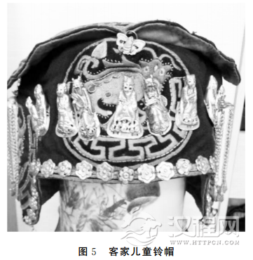 客家服饰中的银饰一般为银扣或 银 铃 帽 等。银扣,可分为银链扣及银扣两种。普通银扣一般常见于客家大襟衫的衣襟处,造型大多以简约琵琶扣、双球扣等,纹样图案有花卉及凤凰等。银链扣一般出现在围身裙上部装饰花边上,主要以装饰为主,没多大实用意义。图 5 所示银铃帽,是儿童童帽中的一种,因其装饰品主要为银制品故称之为银铃帽。铃帽中的银饰造型图案较为丰富,且多以神仙人物像为主,例如八仙、罗汉、观音等,或以能辟邪消灾的图腾纹样通过浮雕工艺表现在银饰上。民间流传着清脆的银铃声可以驱散妖魔、保佑吉祥的说法,长辈为了孩子们能平安长大,所以垂于帽边的银饰吊坠在客家童帽中常常可以见到,如图 6 所示。