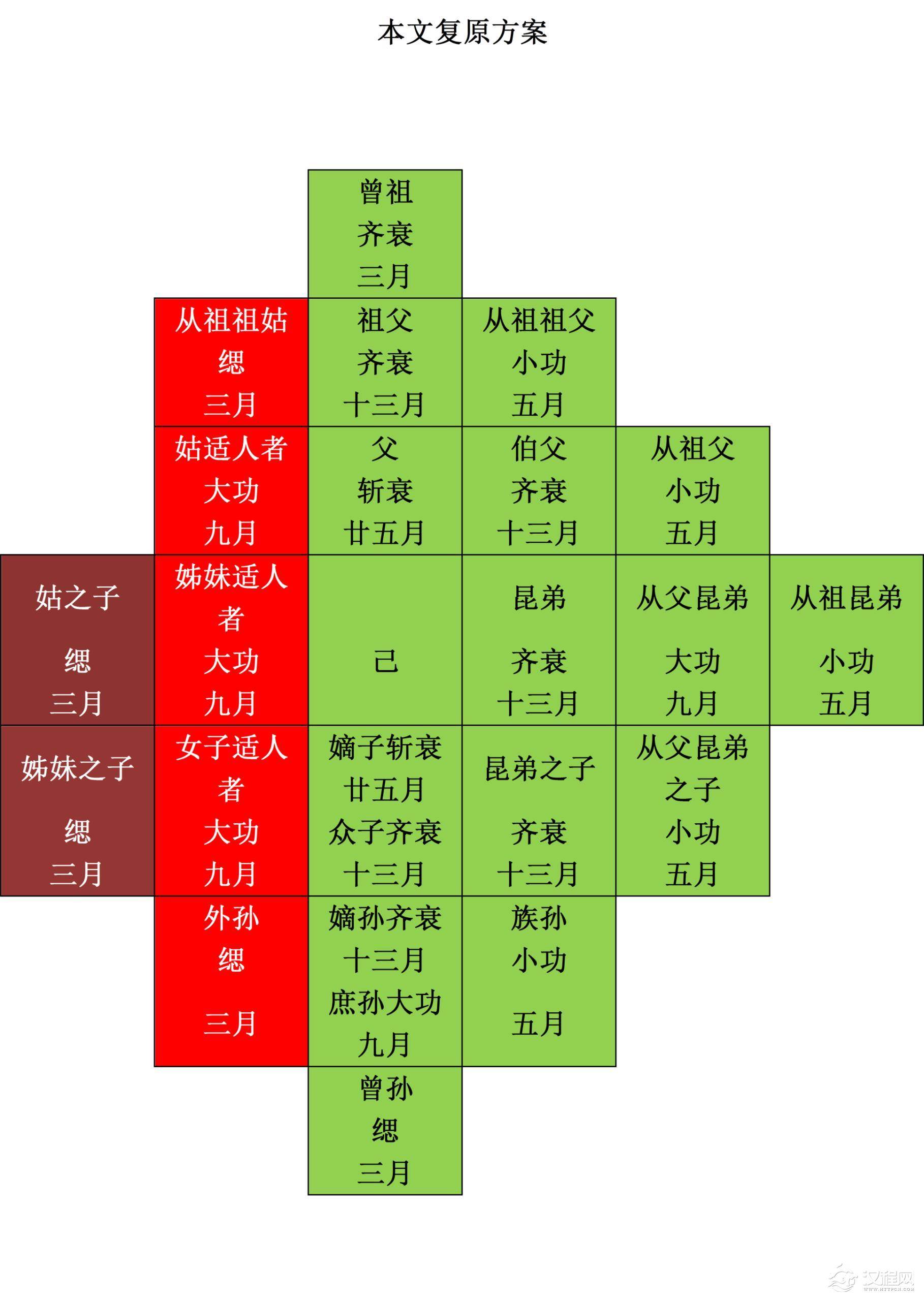 需要补充说明几点,一是嫡子在《丧服图》题记部分没有提及,由于程少轩《新探》所举的残片即是父为嫡子所服,所以我们在复原图中将其补入。其二,题记中所述之“子”当为《丧服》中之众子,按郑玄注即当是士之庶子,如果为众子所服之本服为“齐衰九月”,那么与《丧服》为众子服“齐衰十三月”有所差异,而《丧服》传文未予以解释。我们知道《礼记·大传》有“上治祖祢,尊尊也;下治子孙,亲亲也;旁治昆弟。”作为丧服服术的原则,传文以“尊尊”调整丧服皆有明文,而以“亲亲”调整丧服却多语焉不详,作为一种合理的解释,为“众子”、“庶孙”的丧服调整,应该都是根据“亲亲”原则加隆的。为庶子根据“亲亲”原则从“齐衰九月”加隆至“齐衰十三月”,为嫡子则再根据“尊尊”原则从“斩衰十三月”加隆至“斩衰二十五月”。可以平行对观的是为庶孙根据“亲亲”原则从“大功七月”加隆至“大功九月”,为嫡孙则再根据“尊尊”原则从“齐衰九月”加隆至“齐衰十三月”。无疑这样推得的平行关系是可靠的。其三,同样我们也可以得出,为从父昆弟所服从“大功七月”加隆至“大功九月”,是与为昆弟所服从“齐衰九月”加隆至“齐衰十三月”相平行的。另外,《丧服图》题记部分所述之“孙”,我们认为是指嫡孙,其位置在《仪礼·丧服》中正处于“伯父、昆弟、昆弟之子、庶子”与“姑、姊妹、女子子”之间,关于这点,之前的诸家复原方案都没有说明,而默认此处的“孙”为嫡孙,这与题记中“孙”之前的“子”指众子其实是有矛盾的,目前这个矛盾只能认为是《丧服图》作者故意为之,默认读图者或都明白其中之差异。