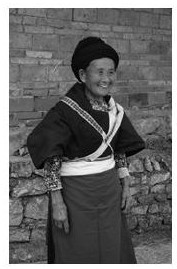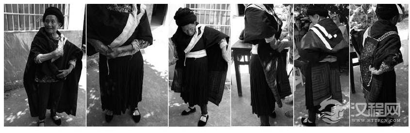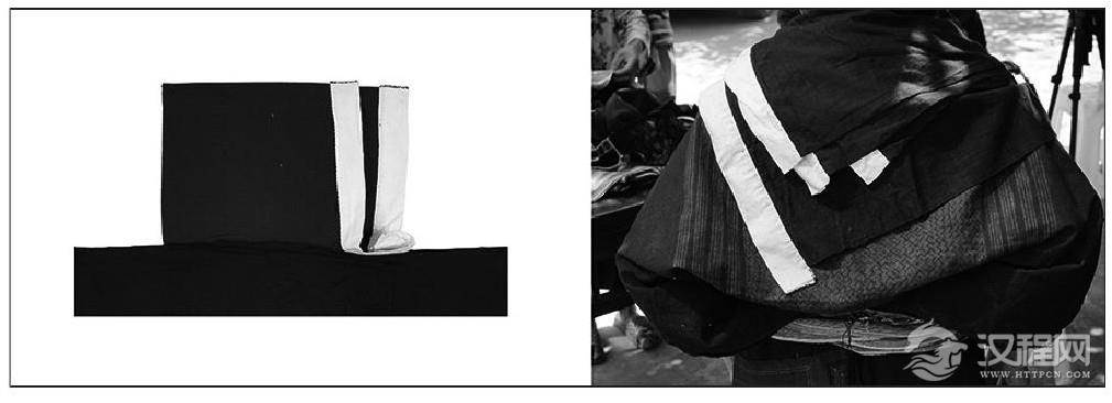 同一系统不同地区又有新的穿法,(如图10、11)为新添寨式盛装穿着,将后片下半部整个翻到后背上,背牌的功用也有所改变,用背牌捆绑固定兜住整个后衣片,这是近现代的创新。这样的造型和日本女子的和服如出一辙。而不管是新衣服新穿法,还是笔者在实地考察中所见的古老穿法,从层层复叠的造型所呈现出的不同仪式感中,可以窥见当年老祖宗设计这身款式的匠心独运,为现代设计造型的实现提供了更多的可能性。