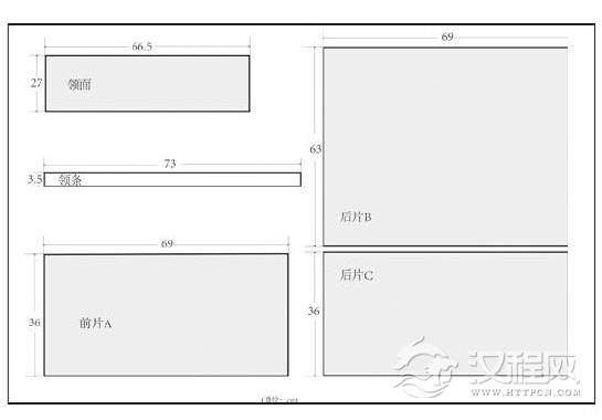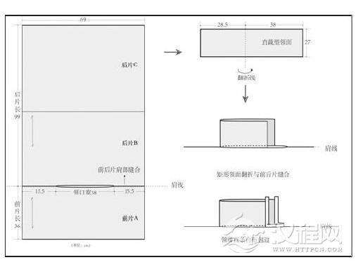 从裁剪图中可以看出,整个上衣的构成仅三块矩形面料。通身直线裁剪构成,领窝线也是直的,裁片基本上都是依照布料的原形呈现矩形的状态,结构线也都是保持直线为主。