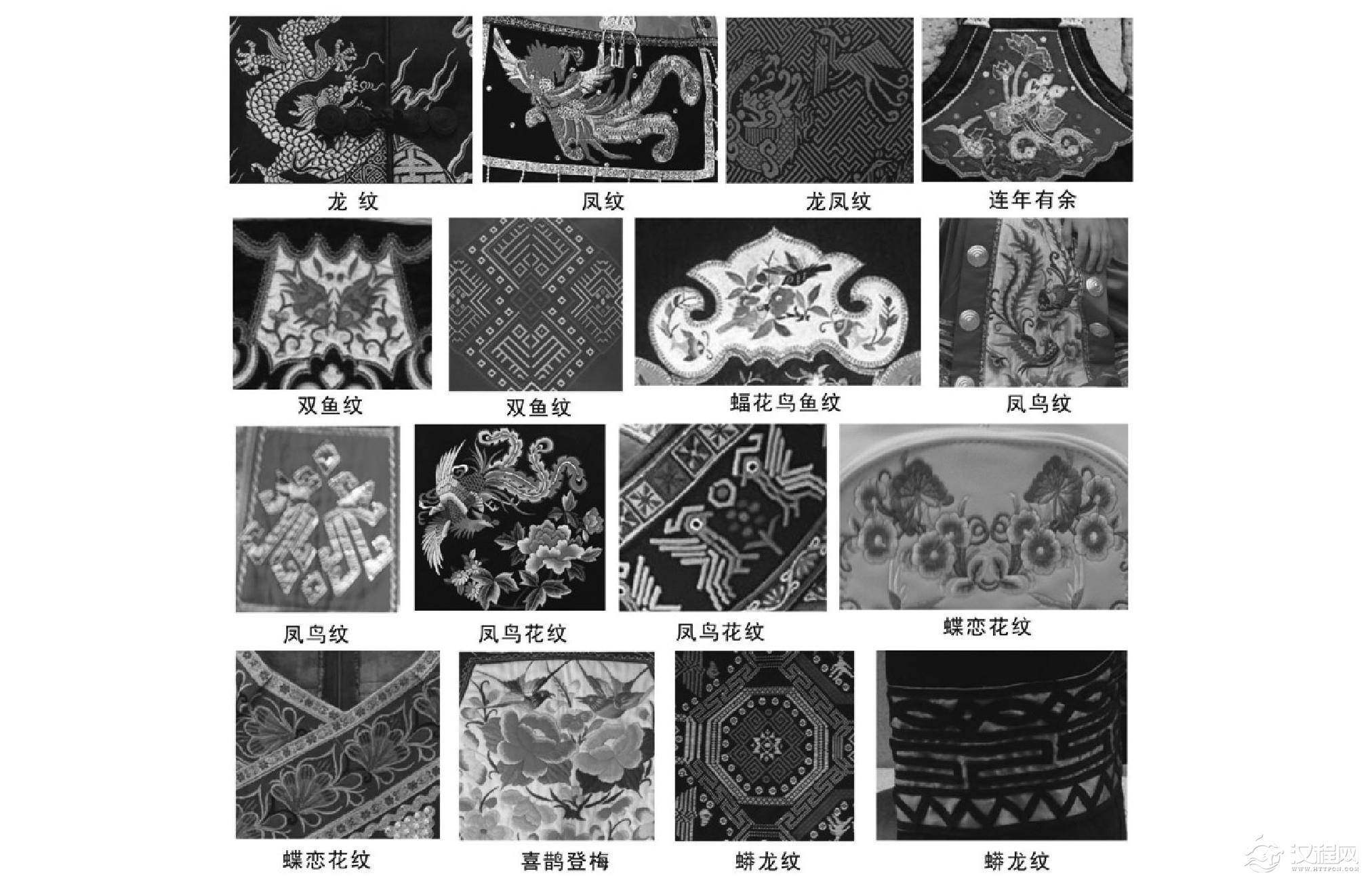应用到壮族服饰上的动物主要有:龙、凤、鸟、鱼、蝙蝠、蝴蝶、喜鹊等具有吉祥寓意的动物,而这些动物也经常结合其他的图纹一起出现在服饰上,同一种动物也会有若干的表现形式(见图2-2),稍加变化或者组合就形成了另外的纹样,因此动物纹在服饰上的应用是变化多端的,常见的具有典型代表性的有十一种,寓意见表2-2。