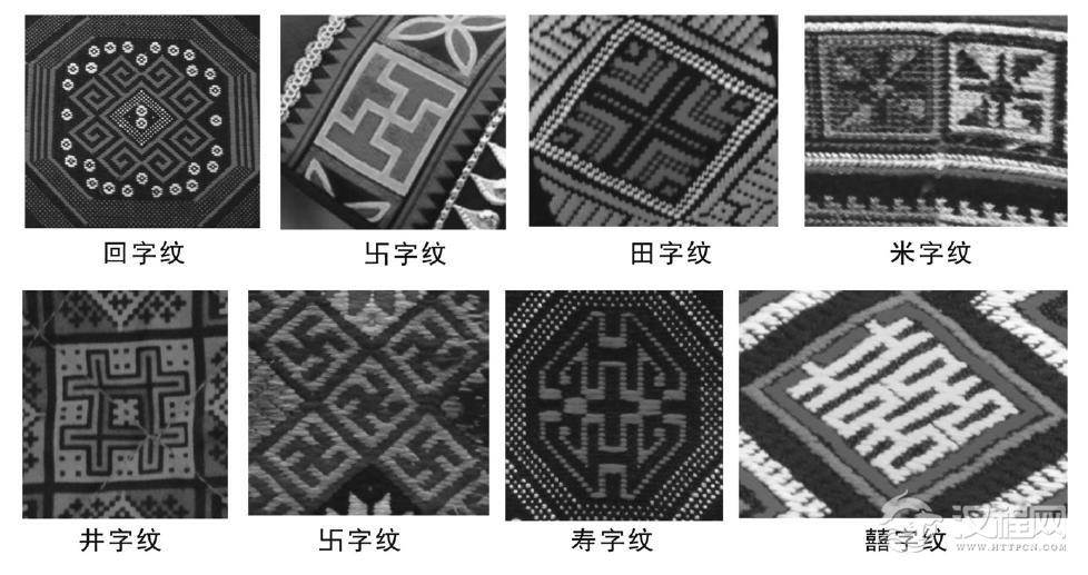 壮族是个开放包容、兼容并蓄的民族。壮族人民在继承发扬本民族的优秀文化的同时,也积极与其他民族文化进行交流。壮族服饰文化作为一个重要载体,可以看出壮族文化与其他民族文化交融的痕迹,如艺术字,作为汉文化吉祥寓意图案中的一种表现形式,也频繁出现在壮族服饰构图纹样当中,形成壮族传统服饰构图纹样中的一类特色纹样——字纹(见图2-1)。