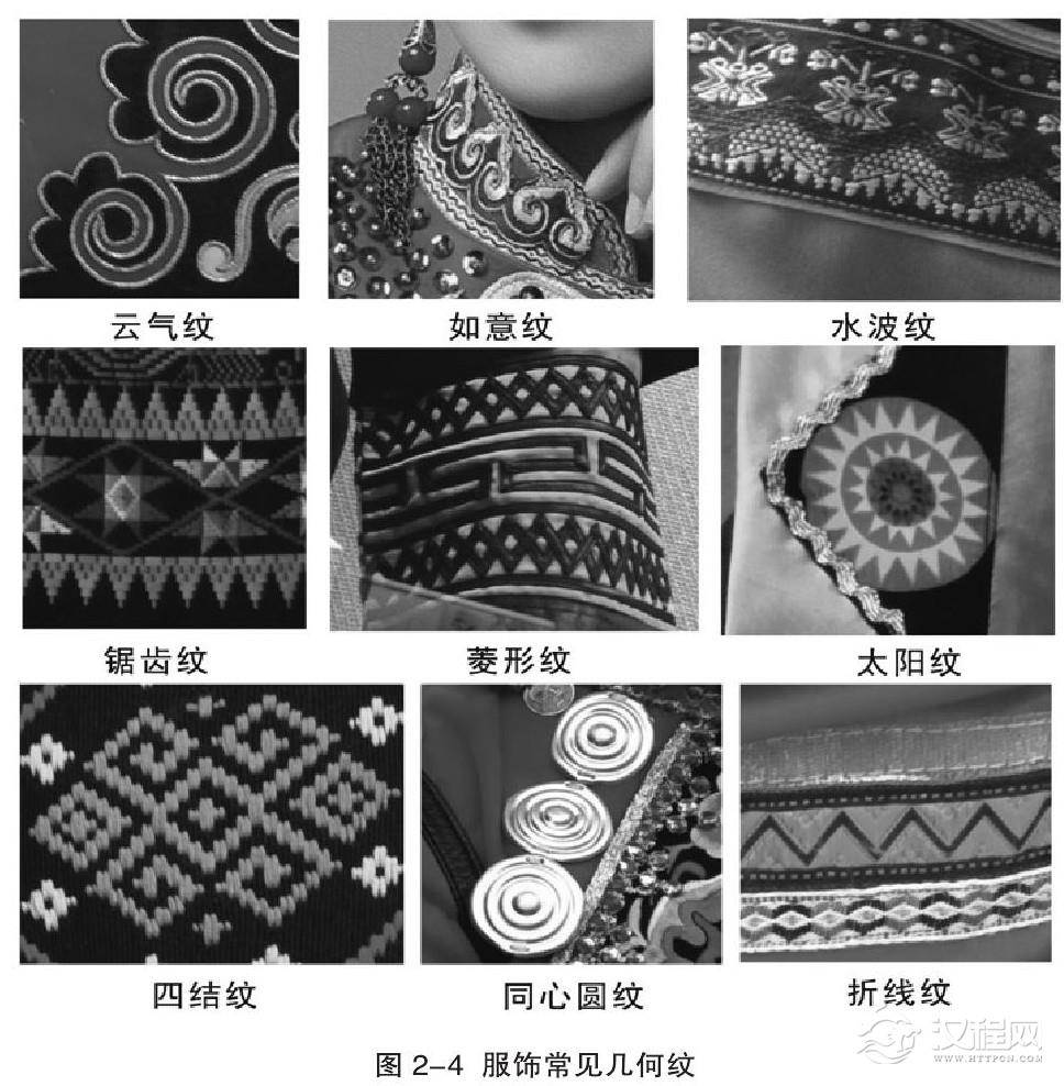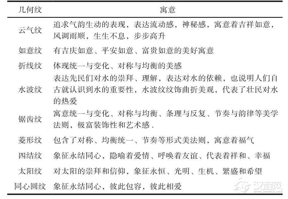 常见的几何纹有菱形纹、云气纹、如意纹、水波纹、锯齿纹、八角纹、太阳纹、同心圆纹等八种(见图2-4),都是壮民对与太阳神、雷神、水神敬畏崇拜的客观体现,并有一定的寓意(见表2-4)。