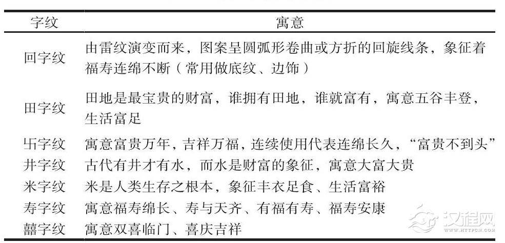 字纹是壮汉文化融合的直接体现,也是壮族人民对美好生活向往与追求的直接表达,不同的字纹都代表了不同的寓意(见表2-1)。有的字纹寓意直白明了,古今含义没有偏差,如:“囍”、“寿”,就是取其字本形、本意,表达喜庆、吉祥、长寿的寓意。“田”、“米”、“井”等字纹则是壮民农耕文化的代表,表达了壮民的勤劳勇敢,对“五谷丰登”的美好愿景。也有字型与意义比较独特,历史背景较复杂的字纹,壮民们也同样吸收接纳,取其美好寓意沿用在本民族服饰中,如“卐”字纹,在壮族服饰构图纹样中出现很多。在藏族“卐”字纹是代表太阳的符号,太阳神是苯教最大的神灵之一。在其他民族中,门窗图案也有“卐”字的变体,即取“富贵不断头”的意思[2]。壮民采纳各民族对“卐”字纹的理解和引申含义,在本民族服饰上运用“卐”字纹进行服饰构图纹样设计,是壮民拥有较高审美取向的表现,同时也反应出壮民在发展本民族文化的同时,对外来文化一视同仁的态度,对待好的外来文化同样吸收运用。