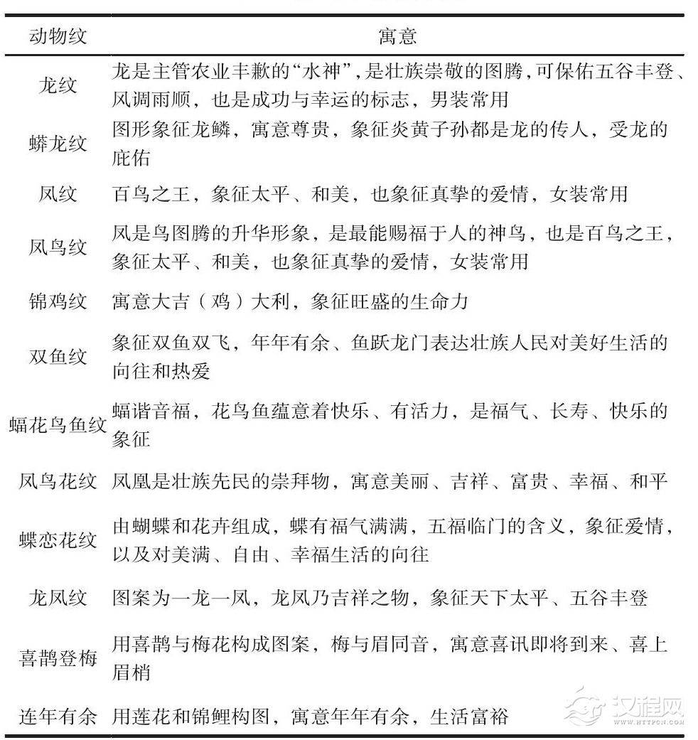 壮民世代居住在岭南这片植被茂密的沃土上,与崇山峻岭中的飞禽走兽和谐相处,因此,山林中的各种表现动物的图案就成了壮族服饰构图纹样中的重要组成部分。