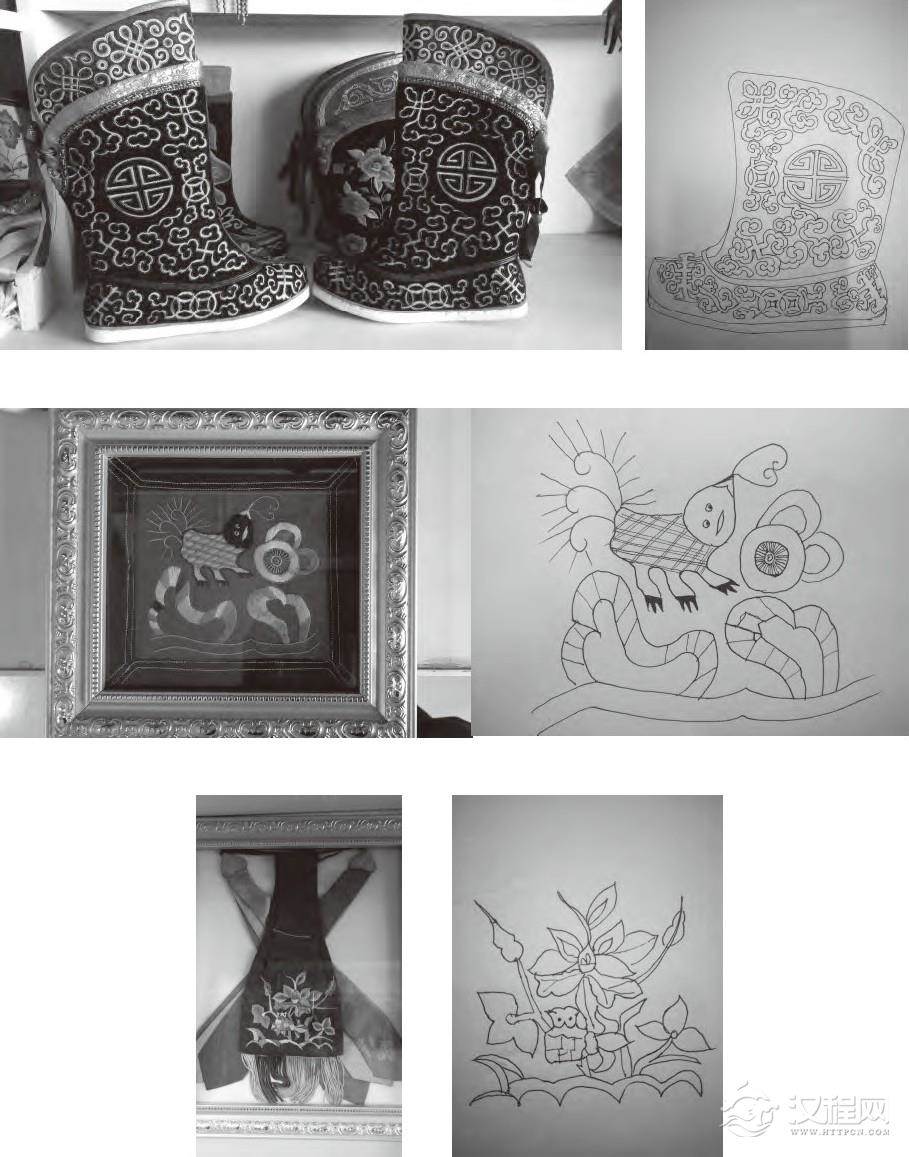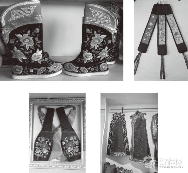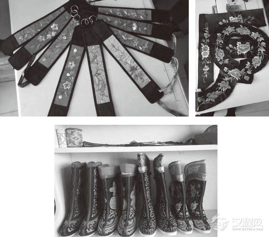 图4.科尔沁蒙古子男士长靴、枕顶、烟荷包及手绘图案