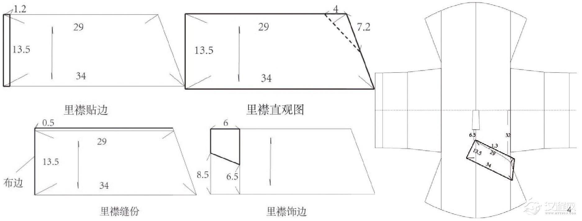 标本里襟为单独一片,面料与衣身亮布一致。里襟结构复原图为直角梯形,短直角边为布边,长度为13.5厘米,上边长为29厘米,下边长为34厘米,斜边裁剪不规则,上边长与衣身缝合,缝份为0.5厘米,上边长缝合的多余量折叠成短边为4厘米,长边为7.2厘米的三角形作为里襟的贴边。在主结构展平状态下,里襟显露出来的量约为1.3厘米。(图3)里襟贴边宽为1.2厘米,里襟饰边是直角边为6厘米的梯形,里襟饰边是大襟饰边的延续。苗族女子上衣的传统平面结构右里襟极短,在斜襟恰能遮挡住的衣侧处横断。据此可看出,在当地较为艰苦、物资匮乏的深山环境中,苗族人是极尽可能力图节俭,而且减少了前襟的重叠量,既便于劳作,又通风散热,讲求外观的完整性,在不透内里的情况下尽量节约(比中原传统汉服要节省很多),苗族做到了极致。(图4)