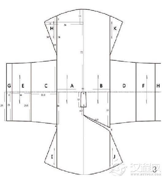 通过对标本结构的系统测绘和复原,发现苗族先民崇尚“人以物为尺度”的朴素智慧。标本主结构为亮布,由衣身、袖子和里襟三部分组成,被分割成A、B、C、D、E、F、G、H、I、J、K、L12片,再加入单独的里襟共13片,衣身AB片为一个布幅,前后中虽有缝合却未破缝,AB片两端均为布边,宽46厘米,加上缝份约为47厘米,故布幅宽约为47厘米。衣身两边采用接袖结构,两袖均有三个片接袖,由C、D、E、F、G、H6片组成,只有E、F为亮布,纱向与衣身纱向相同,C、D、G、H片为白色斗纹面料作基布加入蜡染成袖接缝。衣身前后下摆两侧均有三角侧摆,四片侧摆均为斜裁。三角侧摆巧妙结合接袖片,利用布幅宽度裁剪的设计方法,其目的显然是为适应幅宽的不足。如此以牺牲“主观”满足节俭为准则,增加下摆的活动量,实为苗服古法结构的典型案例。标本主结构中间缝而不破的设计是由布幅决定设计的“敬物”理念,尽可能地保持织物的完整性,以不破坏其原物面貌。当其寿终正寝时(衣片还保持着完整性),还可以最大限度地另作他用。主体测量数据和结构复原图显示,标本结构分割设计都与布料的幅宽密不可分,成为古老苗族斜襟左衽衣古法结构节俭设计思想的直接实物证据。然而主结构中间“缝而不破”或承汉制(清以前的古代上衣结构均“中缝制”),但又与汉制的“缝必破之”不同。(图3)