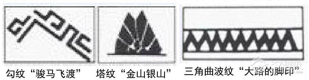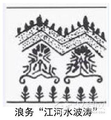 苗族经历过数次大迁徙,分散在各个地域,这个民族只有语言没有文字,因此他们把重要的历史场景和事迹通过归纳,概括为简单的图形纹样,绣制在服饰上,苗族人民正是依靠服饰上的记录把历史事迹一代代流传下来,如在贵州的苗绣主要以蚩尤、武器、宗教纹样为主;云南地区的苗族百褶裙象征着在迁徙中经过的洞庭湖、水的波纹和稻田等;湘西的苗绣纹样中最经典的就是“弥埋”和“浪务”的图案形象,两者都是采用挑花技艺实现。“弥埋”图案意为“骏马飞渡”,由勾纹、塔纹和三角曲波纹组合而成,在苗语中分别读成“大埋挡务、大埋卡务”“高本高介”“乃勾阿登”,汉语语意为“骏马飞渡”“金山银山”“大路的脚印”,记录了苗族先民在迁徙时骑马飞渡江河的场景(如图2);“浪务”图案意为“水浪”,即江河波涛,图案抽象的山川树木组成。相传,图案上方的三角曲折纹是长江、黄河的抽象表达,中间的花纹为苗族人民喜爱的“经历水浪的妈妈花”,下方的花纹代表着一排排树林(如图3),情感丰富的苗族人民用图纹纪念曾经居住过的地方以及对美丽环境的向往。