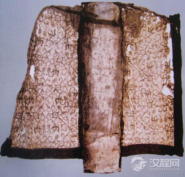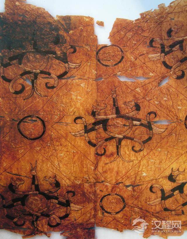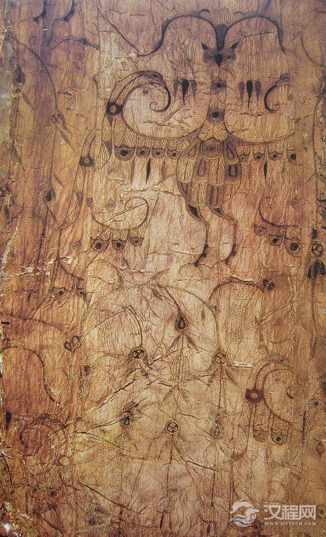 浅黄绢刺绣凤鸟花卉纹锦袍(图1-1-2-8),身长165CM,袖展125CM,此袍为三角形领,右衽,直裾,辫子针绣。主体凤鸟图案,夸张变形,头冠高而华美,羽翅以点线面的组合模拟羽毛形制,以红棕、褐等色线填满翎端,风格华美,是一件战国时期难得的服饰刺绣精品之作。