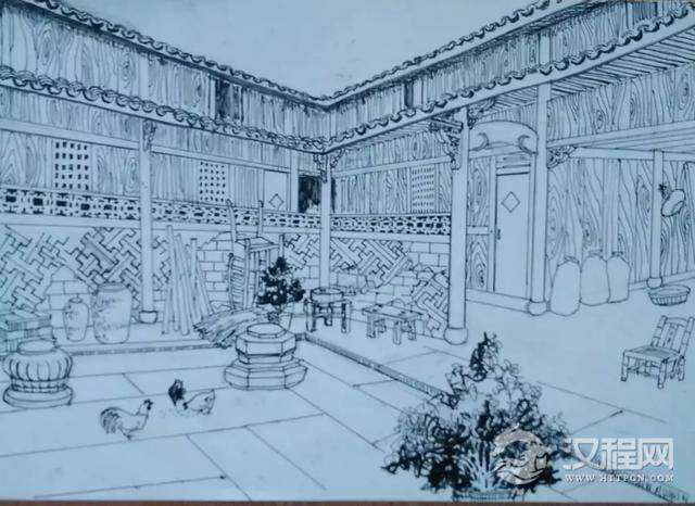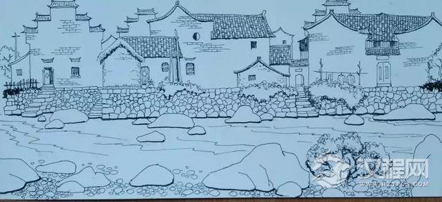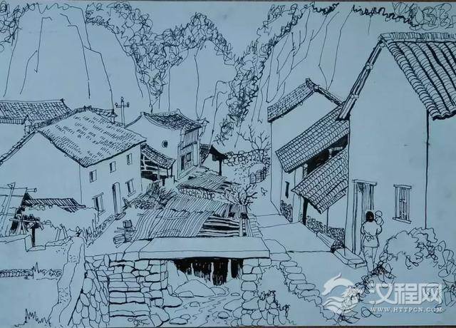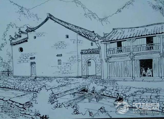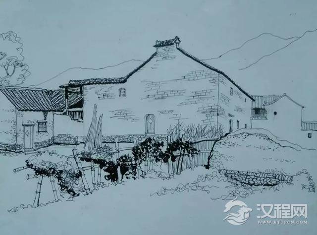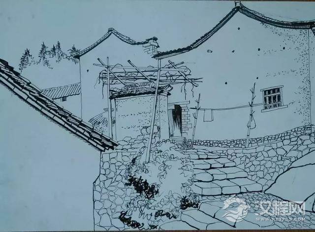 新宅村距武义县城南18公里,西临菊溪,北、东、南靠山是个山乡村。一条山石砌筑的台阶将你引向一座青瓦黄土的土坯老屋,老屋门口立了一堵黄土照壁,落了叶的葡萄藤蔓布大门和照壁上方的藤架上,旁边的稻草垛散发出泥土的芳香,秋后的暖阳照在屋前,一杆凉哂杆还等待着洗衣未归的婆娘给它摊上衣裳。画家抓住了这保留古老照壁的人家,用钢笔线条粗细变化记录下老屋場景,让当代人感悟山乡古老的文化现象。