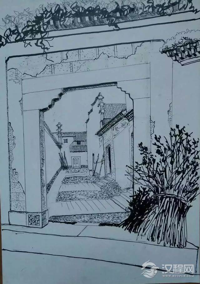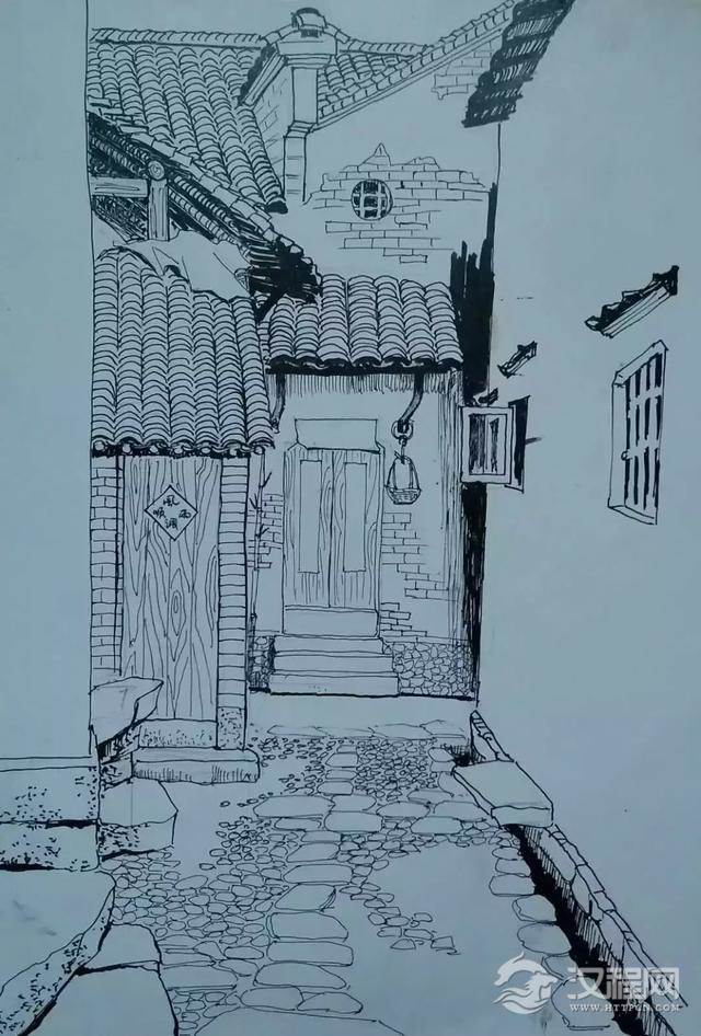 武义县郭洞村起源于元朝,至今巳有680年历史,其先祖何寿之仿《内径图》巧妙利用自然山川地势和风水理念筑城建桥植树造林聚气藏风形成“山环如郭,幽邃如洞”的绝佳人居环境,故村名郭洞。幽邃小巷的转弯处,一扇贴有春联的屋檐下挂着一只竹篮,晒衣竹叉倚靠在墙边、一扇斑驳的木门上方贴着新春时的斗方,“风调雨顺”四个浓墨楷书寄托着农家的希望。小巷磨得铠亮的石子路留下岁月沧桑,小巷深深通往何处让人遐想。画家运用钢笔线条的粗细,笔触的点、擦、涂丰富了画面效果,墙面的大块留白与斑驳密集的木门纹理产生强烈的对比,此处幽静古朴让人乡愁。