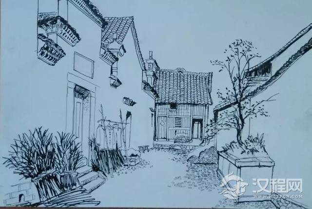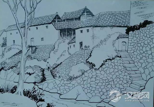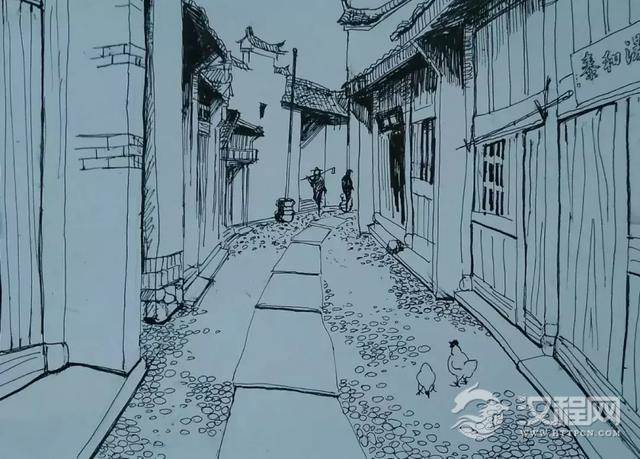 武义岭下汤距县城20公里,建镇已有900年历史,因村镇山上有赤紫圆岩数块,故称枣岩,又因此村镇处在少妃岭脚和大殿岭下又是汤姓聚居地,故名称岭下汤。一条铺有青石板的街路通向远方,街道两侧林立的商铺已没有了昔日的辉煌,沾满灰尘的“汤和泰”招牌还挂在店的上方,但紧闭的店门已告知此店已不再营业,远处汤氏特祠门前的两根旗杆还高高耸立,蒋介石题贈汤恩伯的“中山发祥”石碑还保存在特祠里,武义通往丽水的官道驿站已没有了旧时的喧哗。现在村镇安逸又宁静,年轻人大都外出打工创业,留下的老人还守望着这片故土。画家用朴实的钢笔线条描绘了街景,两个人影和近处觅食的鸡打破了古村的寂寞,给古街带来了一点生气。