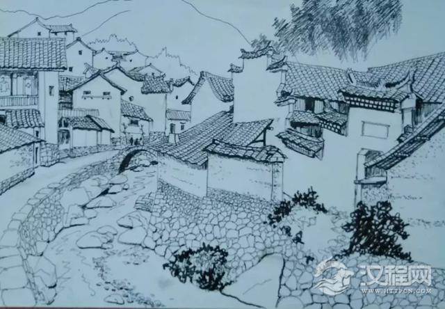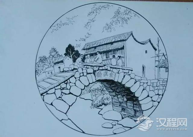 一座用巨大鹅卵石垒砌而成的石桥屹立在眼前,条石台阶磨得铠亮,桥中间大石上刻着显赫的几个大字“金溪桥”,桥长8、2米,宽3、2米,如此庞大的石桥没有任何水泥沙浆和粘合材料完全靠古老的拱形力学道理巧妙砌筑而成,如此高超的筑桥技艺世上少有。古桥没有装饰打扮,沾满青苔的鹅卵石和石缝里伸出得绿色植物,让石桥显得苍劲结实。在夕阳的晚风中,桥上两边垒着的石条坐着几个老人,他们叼着竹烟筒,唠嗑趣事,此番惬意逍遥让人羡慕。作品用精致的钢笔线条编织出一幅桃源桥乐图。