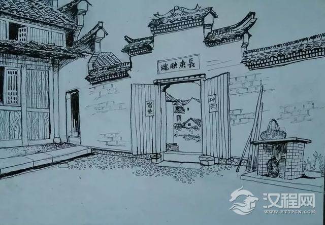高高耸立,大门墙顶瓦脊上摆放着双鱼戏珠石雕,寓意年年有余丰衣足食,降水灭火保宅平安,门额上一块麻石门匾雕刻着"长庚映瑞"四个大字,望家族世代吉星高照家和瑞祥。两扇沧桑的大门上贴着“神荼”和“鬱壘”门对,这世上少见的远古新春门对在这偏辟的山村还延续着,这神荼和鬱壘哥哥是远古专门抓鬼捕虎的一对兄弟,人们就将他俩作为门神守护家院以驱鬼避邪保一方平安。山村民居上这些建筑元素都反映了农耕文化的精华。画家在写生时注意到这里特有的文化现象,将它忠实地记录下来,让我们至今还能体验到远古的文明。