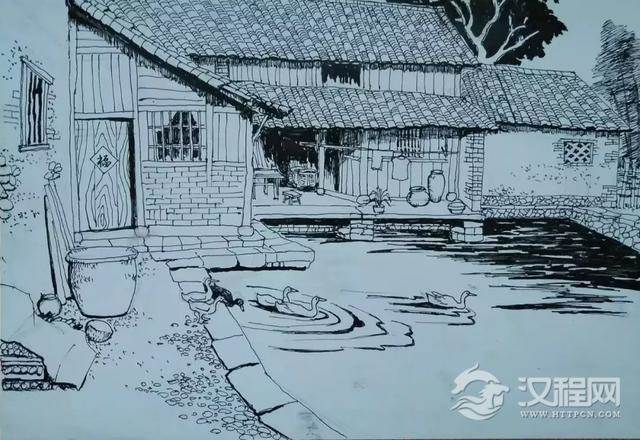农家后院有一口塘,朝西的偏房临水塘而建,为利用阳光开辟一处廊台,既可堆放缸缽杂物又可闲歇晒阳。贴着“福”字斗方的厨房门虚掩着,女主人正在屋里抄菜做饭。屋边有丛修竹大树,几只塘边水鸭正跳跃塘中嬉水欢唱??,画家细致地描绘了池塘人家的生活場景让人们感受到农家祥和惬意的生活。