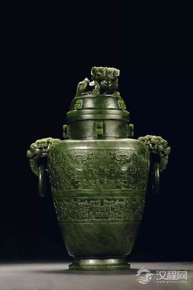 ▲清乾隆 碧玉夔龙纹兽耳衔环狮钮盖瓶