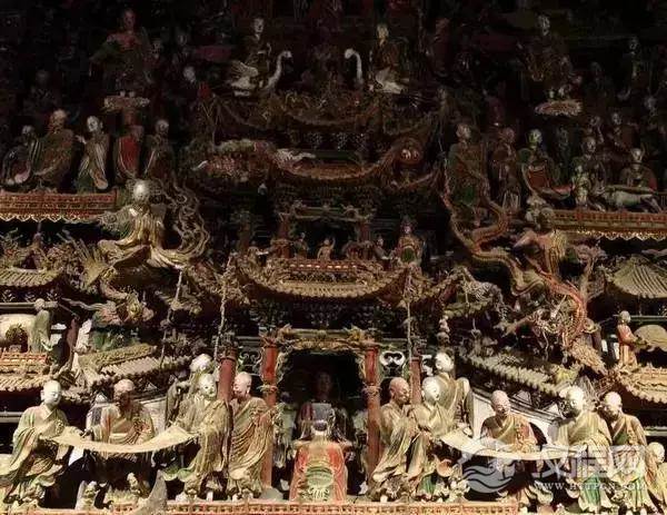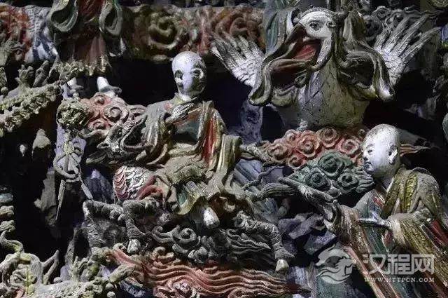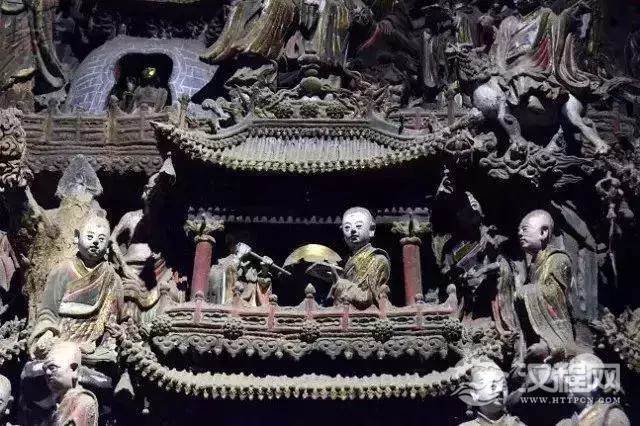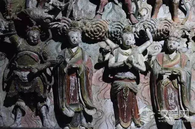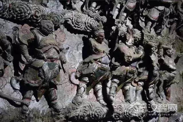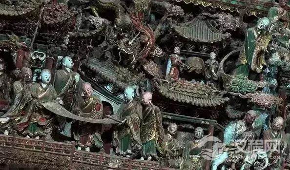 壁塑群把绘画、圆雕、浮雕、楼刻艺术手段容为一体,在墙、梁、柱上