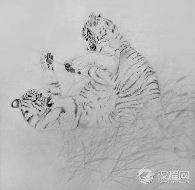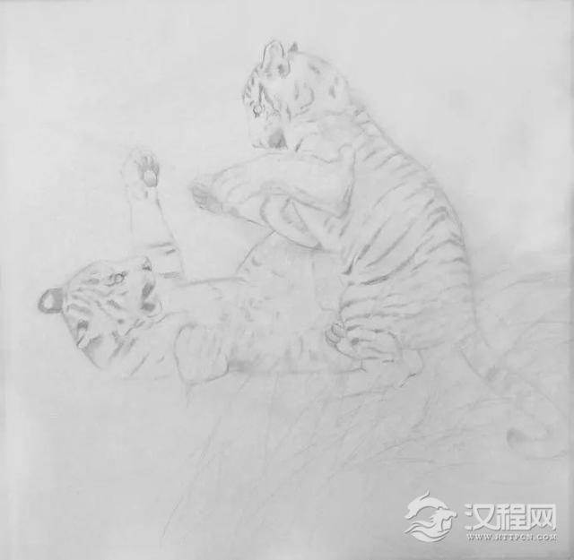 二 、用较淡的墨干笔画出虎的形象、花纹,大致画画即可,千万不要急于画细,为以后深入刻画留有余地。用白矾水加淡墨赭石画出前面草,干后能隐约看到即可。草的穿插需认真组织。