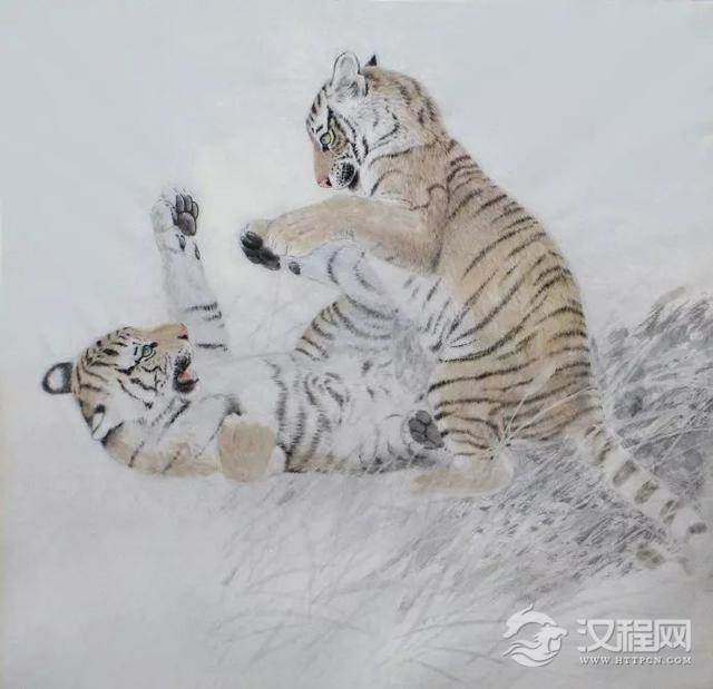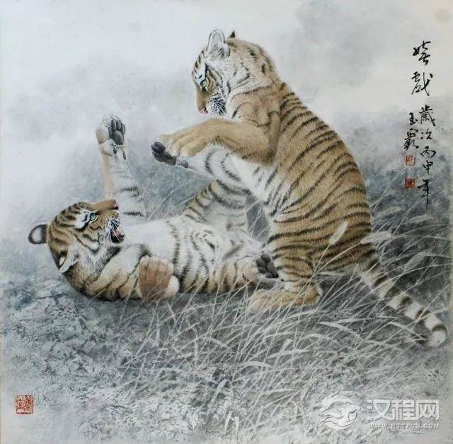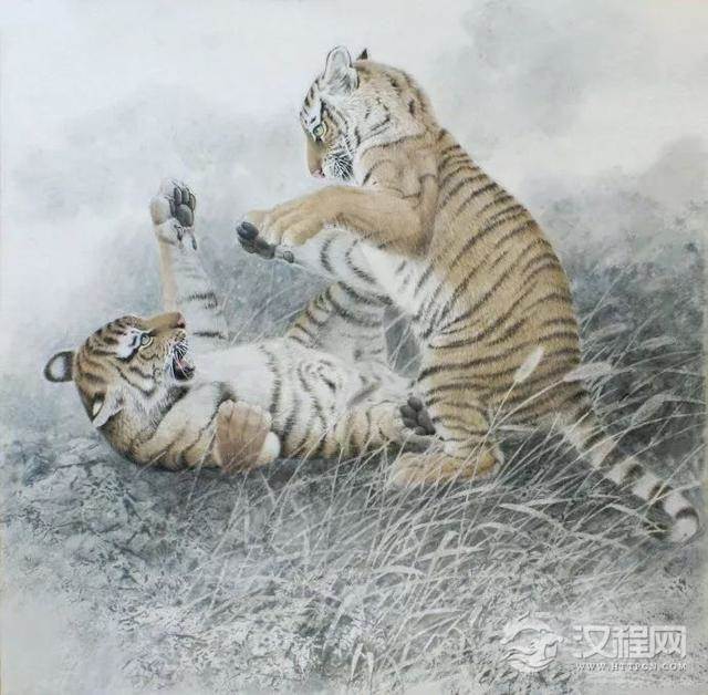 四、深入刻画,有些细小部位用小勾线笔认真组织丝毛走向,切记不能画死,穿插错落求有变化。用花青淡墨染前面的草丛,需要加重的地方把纸翻过来在背面染,再翻过来正面调整,认真对待草与虎的接触部位。左侧土地是把纸揉成团再展开用淡墨扫出,干后喷水罩染,远处加洗衣粉做出肌理。