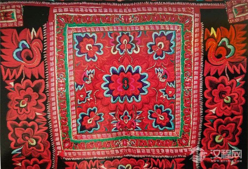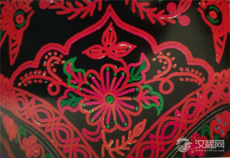 彝族服饰中的植物花卉图案,可用于局部点缀,也可以大面积使用。花以深红和浅红为主,由波浪纹和回旋纹构成;花的周围散布着大小不一的绿叶;
