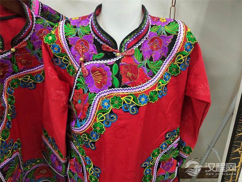半截裙中直线线条较为平滑,疏密相间,简洁而不简单,大气而重细节。并且以不同深浅的红为底色,色彩艳丽,中间再穿插一些过渡色,具有一种色彩流动的美感。上衣整体以白色打底,再绣上花卉图案,左右对称。